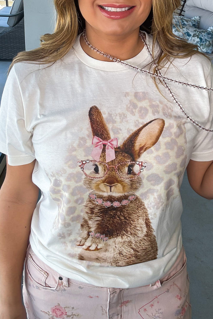 Graphic t-shirt featuring a bunny design and hand-set crystal embellishments