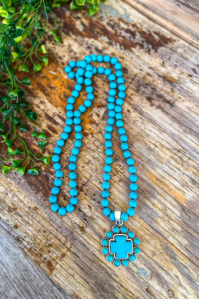 Natural Knotted Howlite Cross Necklace - Turquoise