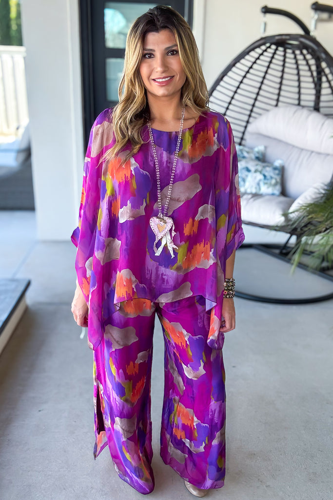 Lightweight, flowy, and flattering on many body types, this top pairs perfectly with linen, denim, or the matching silk blend pants for a chic set look. Easy to dress up or wear casually — a truly versatile piece.