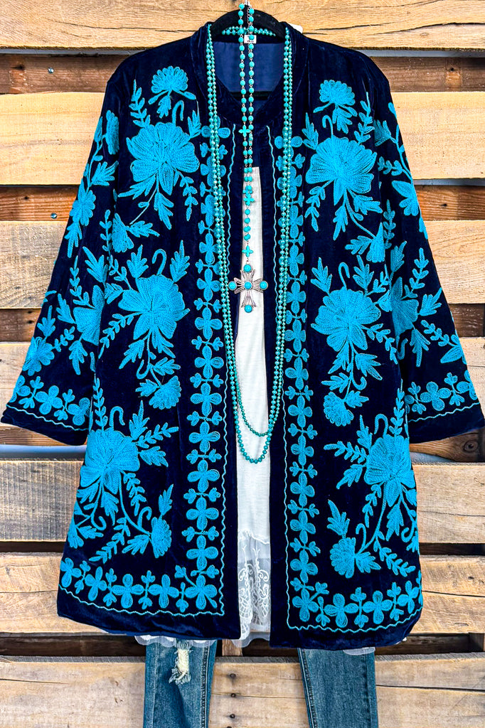 Blue Suede Embroidery Thoughts Velvet Jacket - Blue