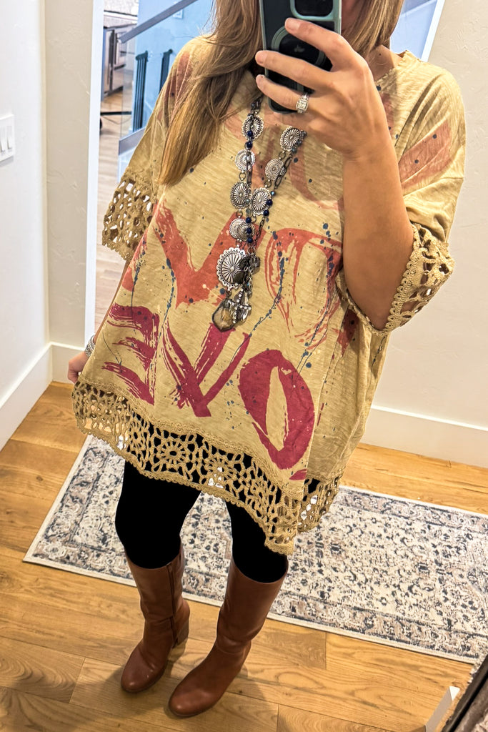 The hand-designed “LOVE” graphic, soft splatter details, and crochet trim sleeves and hem give it a one-of-a-kind, bohemian feel. The relaxed silhouette features a 60” bust, making it incredibly comfortable and flattering, and allowing it to fit up to a size 3X with ease.