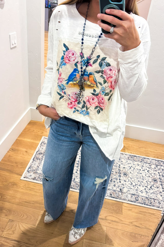 This Rare Bird beauty is full of charm and artistry. Made in the USA from 100% cotton, this top features a stunning hand-illustrated songbird and floral design that feels romantic, soulful, and effortlessly wearable.
